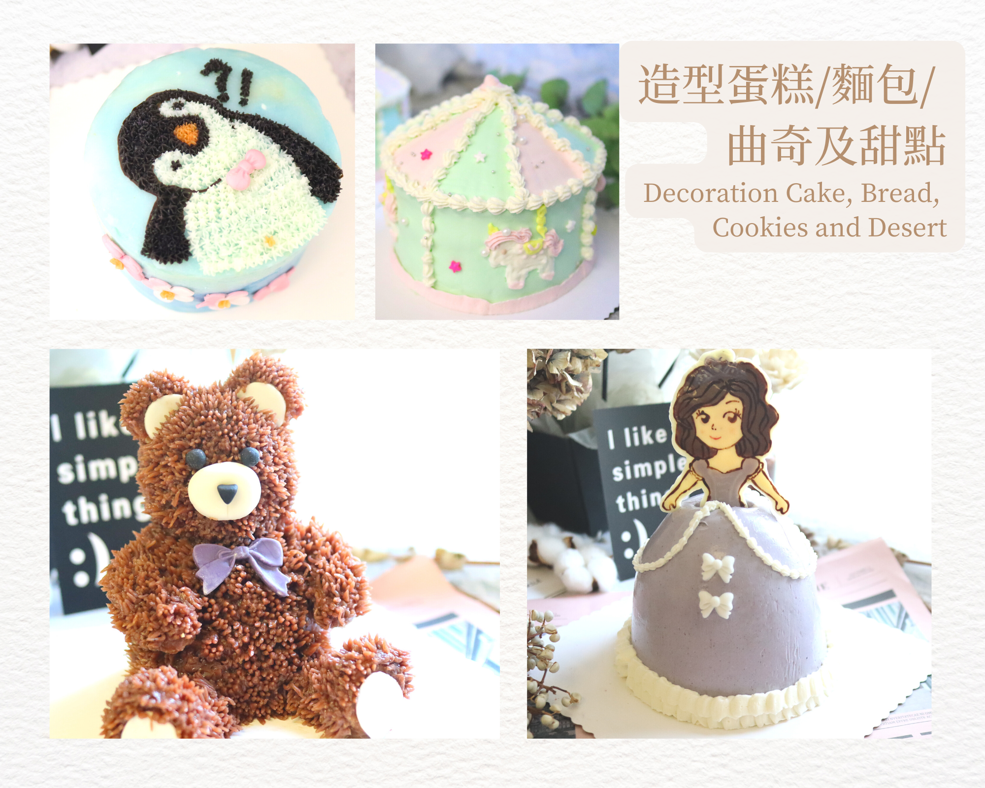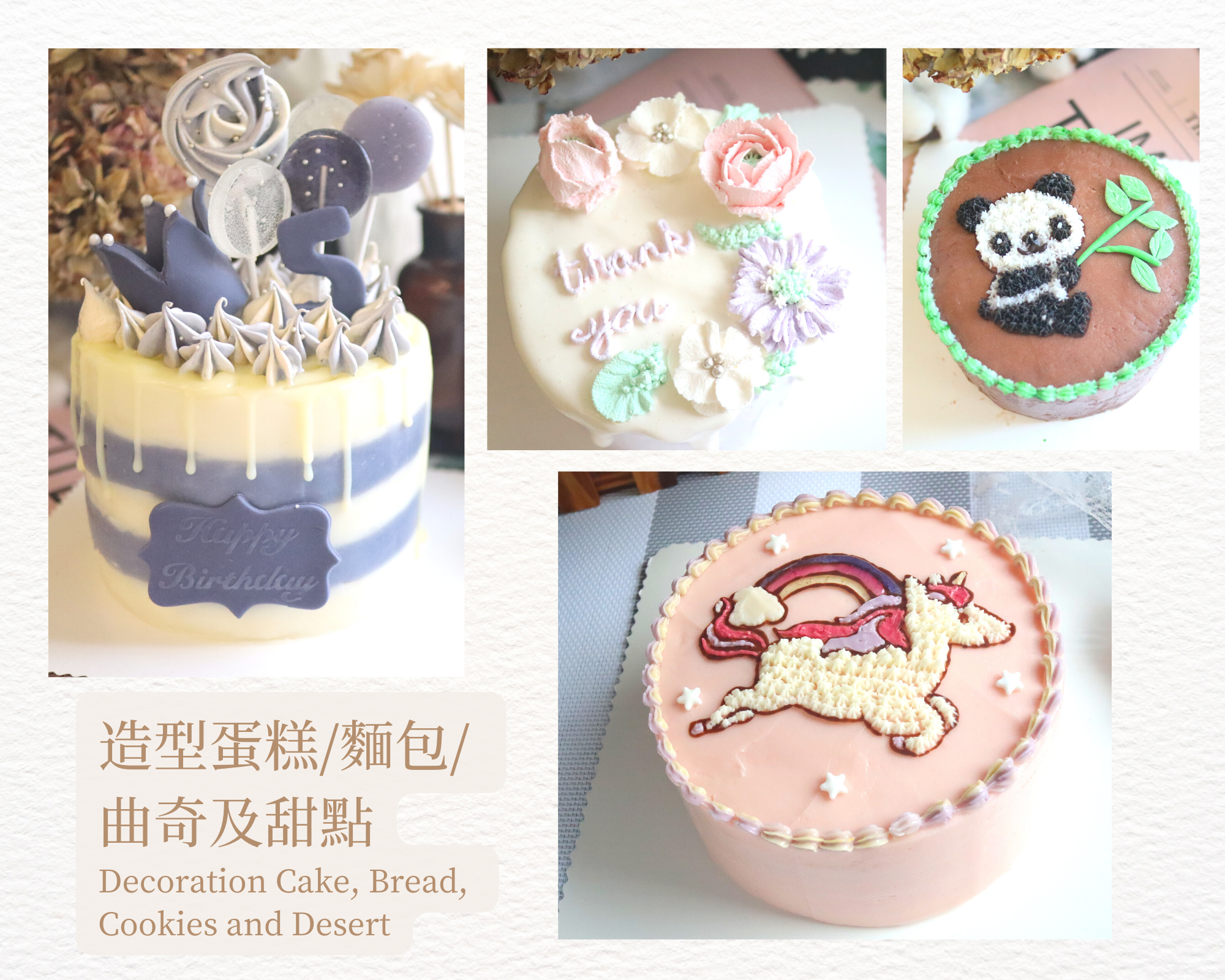 課程包括多種不同種類的蛋糕, 包括忌廉蛋糕, 慕斯蛋糕, 戚風蛋糕等, 而我們的曲奇課程會教授多種技術使你可得心應手地製作出精美的曲奇, 也有把蛋糕, 麵包, 曲奇及甜點製作成不同造型, 所有你喜歡的動物或你富創意的設計都能透過我們教授的技巧後, 應用在你的蛋糕, 麵包及曲奇上, 你可以把這些蛋糕, 麵包, 曲奇及甜點送給親人, 朋友或用在慶祝的日子上, 肯定大人及小朋友均喜歡呢!!